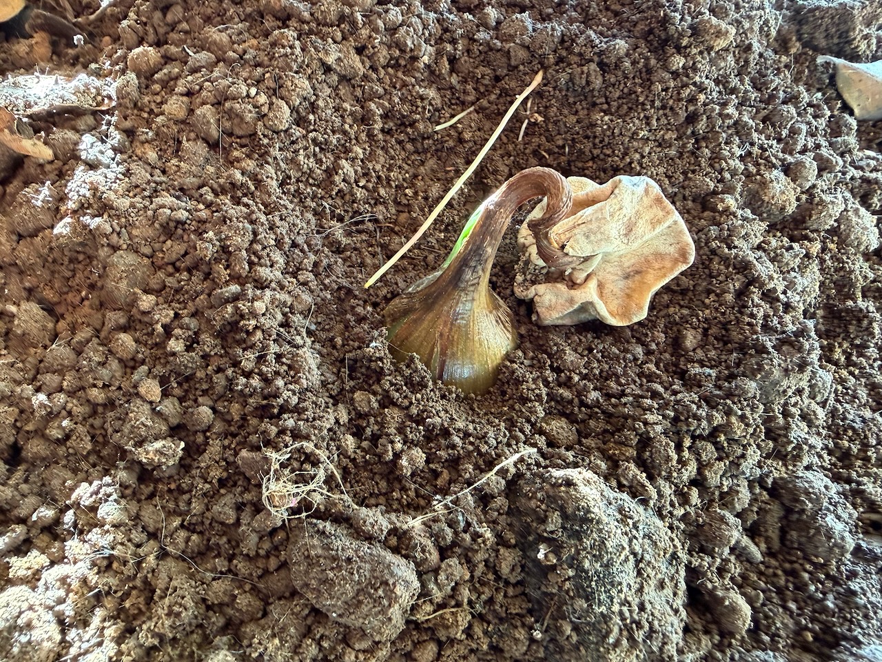 Nachdem einige Zeit vergangen ist, ist klar, dass der Bommel, der aus dem Samen rauswächst, die neue Amarylliszwiebel ist. Die Verbindung zu dem Samen wird irgendwann gekappt. Am anderen Ende wachsen aus den kleinen Knubbeln die Wurzeln raus.