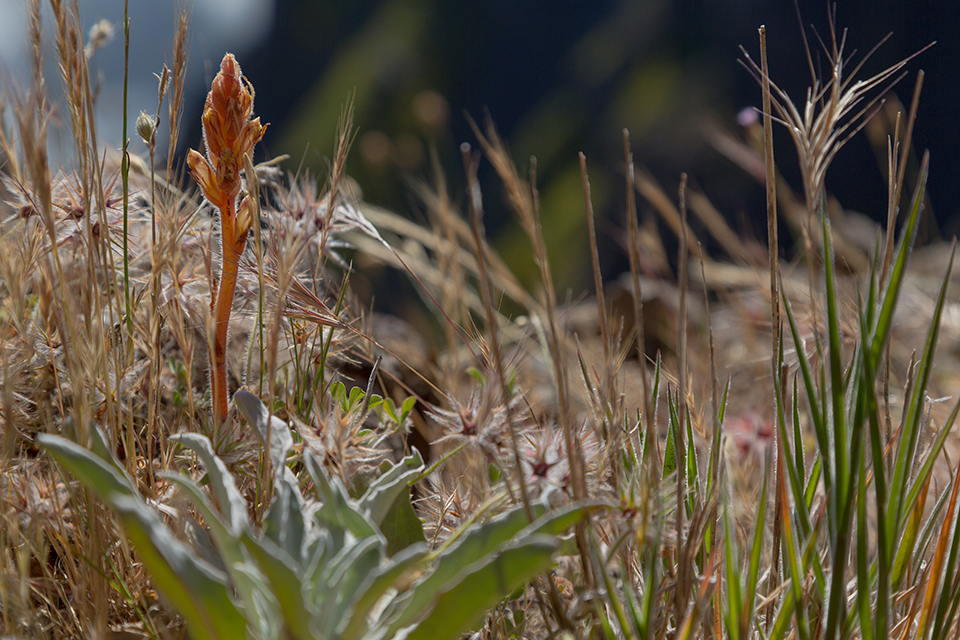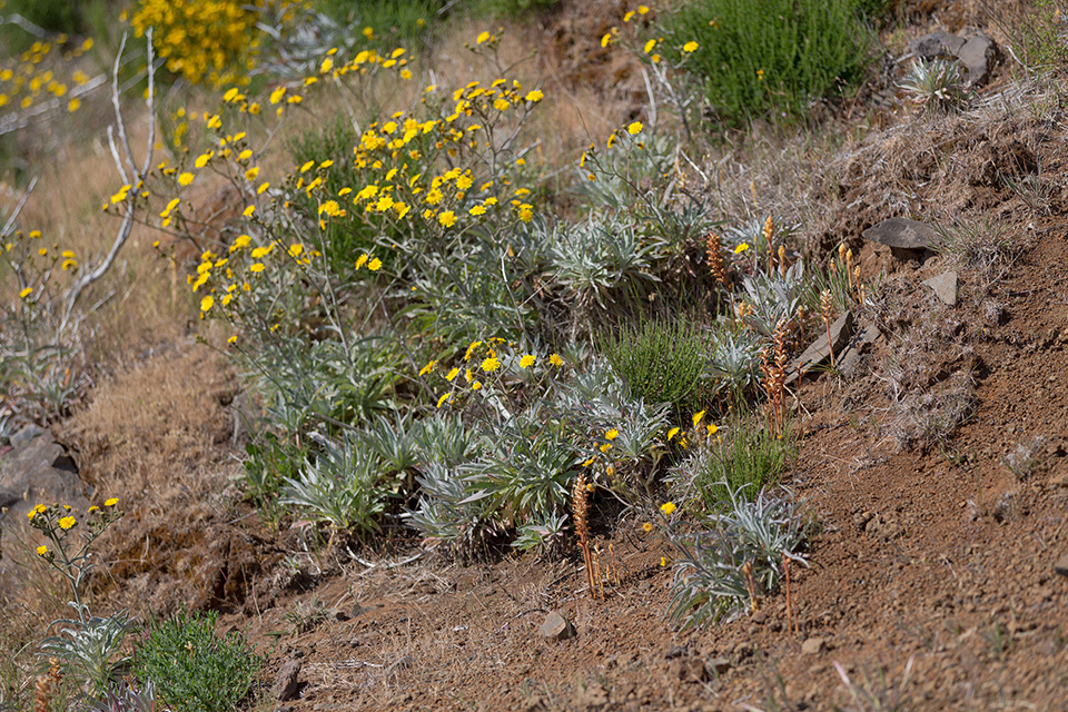 Bild 2: Auf Madeira galten Sommerwurz-Arten laut Literaturangaben generell als nicht so häufig. Und zudem sollten sie vor allem in den unteren Lagen vorkommen. Umso überraschter war ich ich, als wir gleich bei unserem ersten Inselurlaub Unmengen von Sommerwurzen im Hochgebirge sahen. Möglicherweise ist es die Kleine Sommerwurz (Orobanche minor). Die Vertreter dieser Gattung sind nicht unbedingt leicht zu bestimmen und daher habe ich diese Pflanze bisher immer vor mir hergeschoben. Inzwischen habe ich allerdings schon weitere Arten im Gebirge gesehen, die laut Literatur dort überhaupt nicht vorkommen sollen...