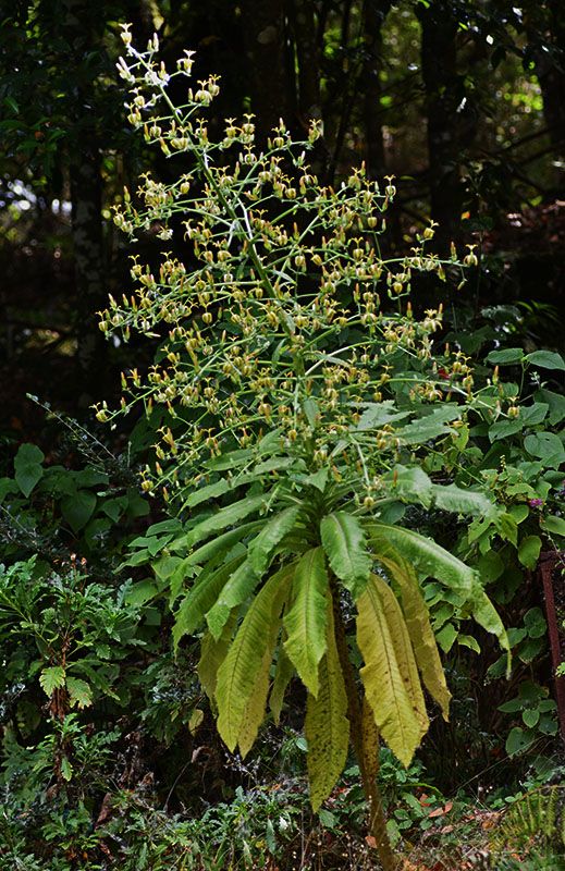 Das folgende Foto stammt vom PR 17, wo in dem Bereich eines Wasserfalles eine ganze Anzahl zu sehen war, aber nur zwei davon mit Knospen und noch nicht richtig blühend. Unter anderem ein wirklich sehr großes Exemplar, bei dem der Blütenstand aber leider kurz oberhalb der Blätter abgebrochen war. Ansonsten hätte die Pflanze sicherlich ein Höhe von gut 3 Metern erreicht.