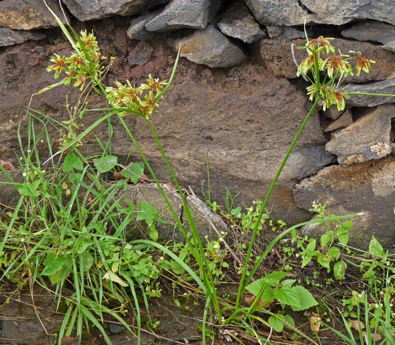 ich gehe mal davon aus, dass die Erdmandel mittlerweile verdaut und einigermaßen gesackt ist. Habe da nämlich noch das das Frischgrüne Zypergras (Cyperus eragrostis). Diese Art wächst ebenfalls in der „Kulturzone“, allerdings nicht als Unkraut in Äckern und Gärten, sondern mehr an Gewässerrändern wie z.B. Bewässerungsgräben oder auch in Rinnsteinen an kleineren Straßen. Allerdings ist sie bei weitem nicht so häufig wie die Erdmandel und nach eigenen Beobachtungen vorwiegend im Südteil der Insel zu finden.