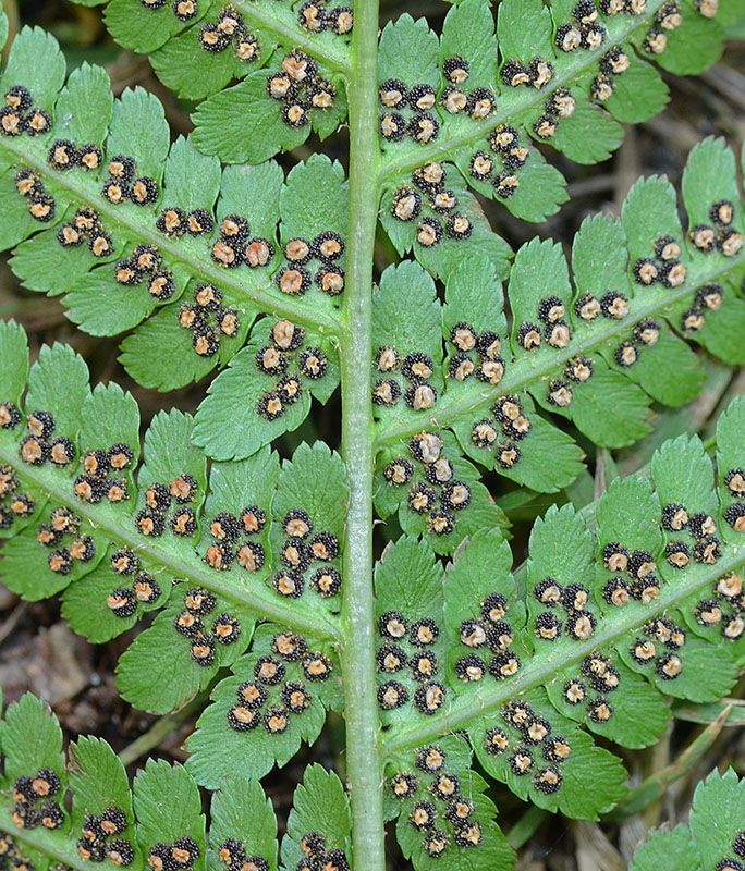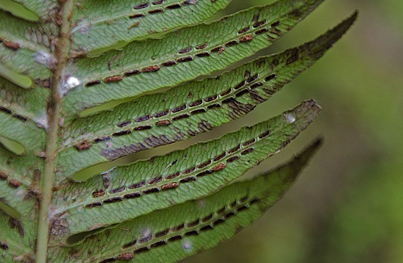Dieses kettenartige Muster findet sich auch auf der Wedeloberseite wieder. So spontan fällt mir im Moment kein anderer Farn ein, wo man die Form und Lage der Sori auch auf der Wedeloberseite erkennen kann. Bei allen anderen muss man sich den Wedel schon von unten betrachten. Neben den länglichen Sori gibt es vor allem rundliche (nierenförmige) oder "hakenförmige".