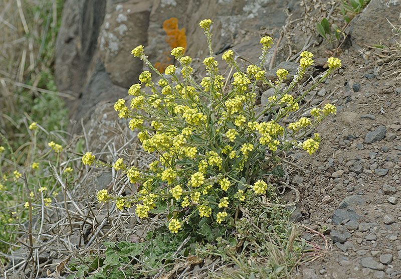 Wesentlich auffälliger waren allerdings die "Gelbblüher", allem voran die Drüsige Wolldistel (Andryala glandulosa), die stellenweise fast fußballfeldgroße Flächen bedeckte. Da es von dieser Art im Forum schon Abbildungen gibt, verzichte ich hier auf ein weiteres Foto. Ebenfalls nicht zu übersehen war ein kleiner Kreuzblütler, der auch in gröberen Mengen in der Gegend rumstand. Der Runzelige Rapsdotter (Rapistrum rugosum) ist - im Gegensatz zu anderen gelben Kreuzblütlern auf der Insel - dank seiner charakteristischen Früchte (falls vorhanden) nicht zu verwechseln.