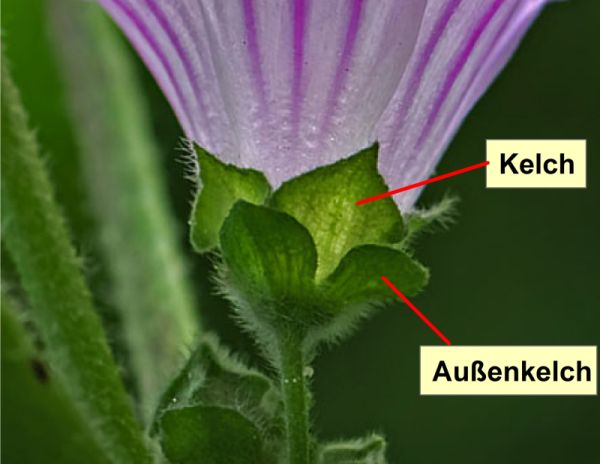 Es handelt sich dabei also um kleine Blättchen, die sich direkt unterhalb des normalen Blütenkelchs befinden. Bei vielen Pflanzen ist so ein Außenkelch gar nicht vorhanden, bei einigen Malvengewächsen hingegen ist er ein typischer Bestandteil der Blüte. Und in diesem speziellen Falle sind die Blättchen des Außenkelches recht groß und am Grunde miteinander verwachsen, was typisch für die Gattung Strauchpappel (Lavatera) ist. Malven im engeren Sinne (Malva) haben zwar auch einen solchen Außenkelch, allerdings ist er dort deutlich unauffälliger und die Blättchen sind nicht miteinander verwachsen.