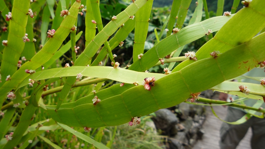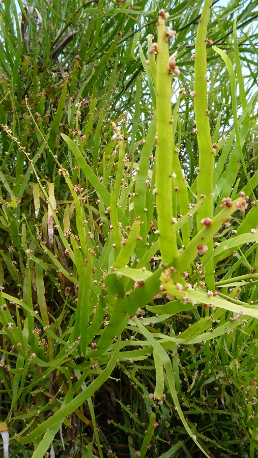 so, auch mal wieder da. Und hat sich keiner des armen Pflänzchens von madBee erbarmt... Ganz spontan hatten wir zunächst einmal ein Kaktusgewächs vermutet, ist es aber nicht. Mit dem Suchbegriff "Phyllokladien" kam man dann aber doch recht schnell zu einem Ergebnis. Höchstwahrscheinlich handelt es sich um den Bandbusch (Homalocladium platycladum), der zu den Knöterichgewächsen gehört. Wer hätte das gedacht... Aber mal abwarten, vielleicht stecken die Molekulargenetiker diese Gattung demnächst auch noch zu den Wegerichgewächsen.