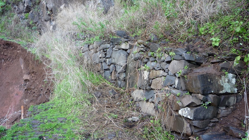Dieser Abbruch war schon im Frühling da, verursacht von einem mächtigen, heruntergestürzten Baum. Wie gut, dass der Regen nicht noch mehr vom Pflasterweg heruntergespült hat.