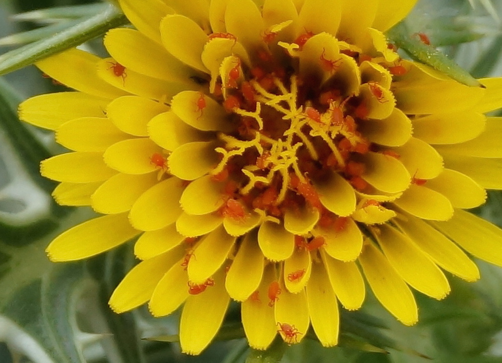 Hallo Velvet, eine Frage zur gefleckten Golddistel. Auf den meisten Blüten die ich sehe, krabbeln immer so kleine rote Milben oder was weiss ich herum. Hast Du, oder natürlich jemand aus dem Forum, eine Ahnung um welche Insekten es sich hier genau handelt. Habe mich schon gefragt, ob es auch Zecken sein könnten. Schaut selbst mal: