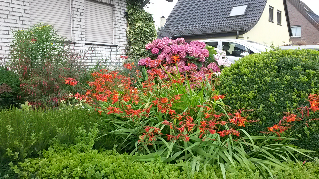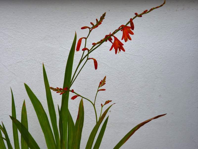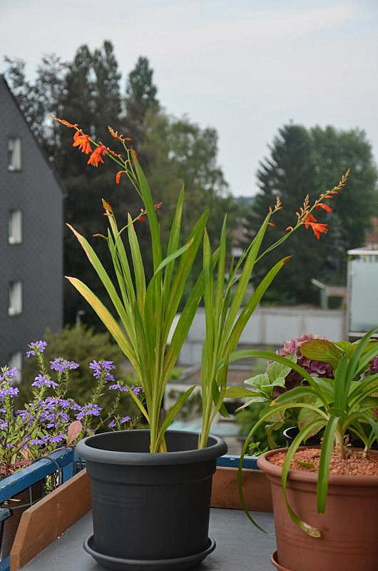 Nachtrag: der Grund warum wir uns bei Montbretien in Bezug auf die regenerativen Fähigkeiten so sicher waren, hat einen einfachen Grund. Wir haben im letzten Frühsommer auf der Insel auch ein paar Knollen eingesammelt (ausgebuddelt?), zu Hause irgendwo zwischengelagert, vergessen, im Herbst wieder entdeckt, eingebuddelt, und innerhalb nur weniger Tage trieben frische Blätter aus dem Topf. Die Knollen überdauern also eine ganze Zeit im trockenen Zustand. Im Laufe des Spätherbstes verwelkten die Blätter dann allerdings wieder. Also das trockene Zeug abgeschnitten, den Topf auf dem Balkon unter die Bank gestellt, vergessen, im Frühjahr wieder entdeckt, versuchsweise gewässert, und innerhalb kürzester Zeit trieben die Knollen abermals aus.