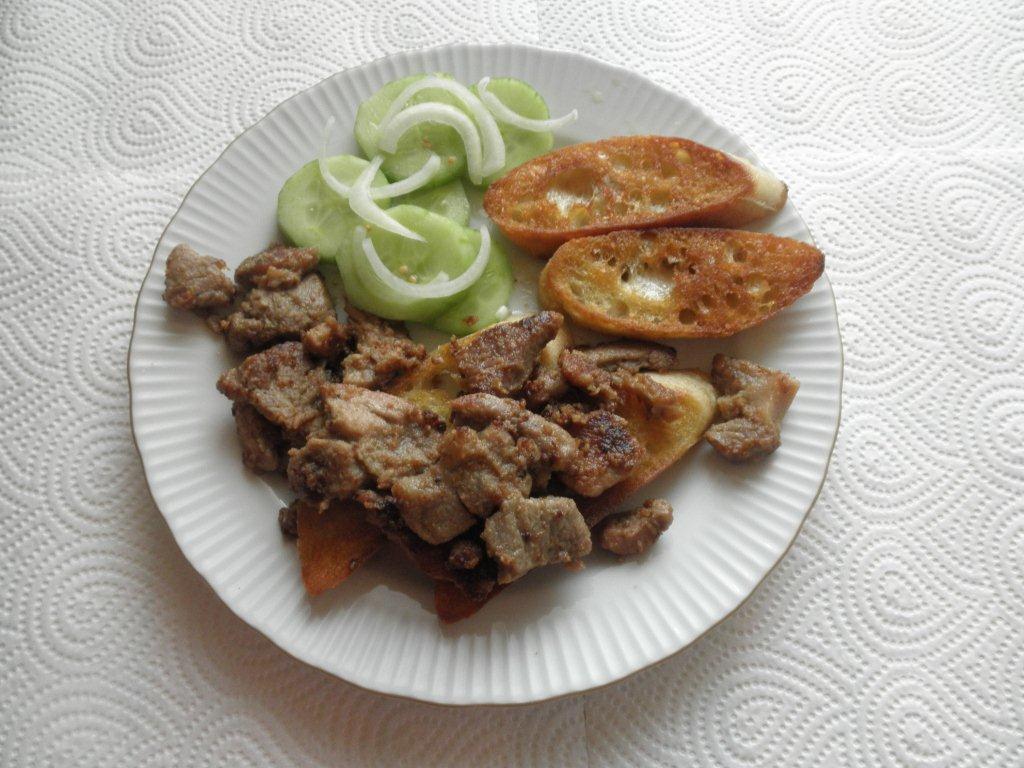 In der Zwischenzeit das restliche Öl in einer großen Pfanne erhitzen. Das Brot hineinlegen und auf beiden Seiten goldbraun rösten. Das Schweinefleisch auf dem gerösteten Brot servieren.
